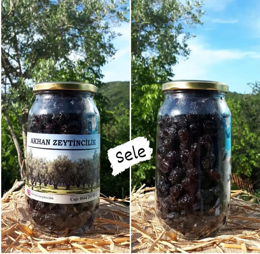 AkhanZeytincilik Az tuzlu, doğal fermente iri boy, küçük çekirdekli siyah zeytini GEMLİK İRİ SELE ZEYTİN'İ 1000cc cam ambalajlarda sizlere sunuyor..